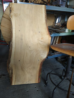 Barre à béton de gros calibre, petite barre à béton, reste de plaque d'acier, cuillères, planche d'olivier