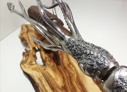 Après avoir choisi cet animal, j'ai longuement étudié sa morphologie et observé de nombreuses photos. J'ai ensuite représenté le poisson sous toutes ses faces puisque toute création débute par une étude minutieuse du sujet qui sera souvent croqué sur papier. J'ai ensuite débuté le squelette sur lequel seront posés les différents éléments. Bien qu'assez basique, il s'agit d'une phase des plus importantes puisque celle-ci donnera non seulement la taille de la sculpture, mais également le mouvement choisi pour l’œuvre. Le choix des couverts et la forme qu'ils adopteront pour l'harmonie du poisson est, à mon sens, l'opération la plus délicate, surtout pour la tête. Il s'agit d'un vaste jeux de puzzle en 3D où il convient, pour chaque pièce, de trouver sa place. Ensuite, vient la partie technique avec la coupe des matériaux utilisés, la soudure, le rabotage des points de soudure et le polissage de la sculpture. Ce fut également la plus longue.