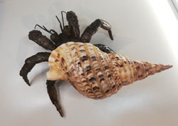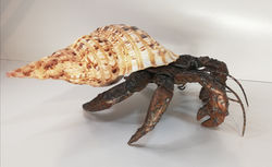 Même si ce petit crustacé est bien sympathique, c'est plutôt ce qu'il représente qui m'importe. Comme lui, j'ai quitté ma coquille, un monde que je connaissais (mon emploi et ma vie bien rangée) au profit d'une autre, mon activité artistique. Tout comme lui, changer de coquille a le désavantage d'être mis à nu, sans protection et sujet au stress de l'inconnu. Mais je reste positif et confiant puisque cette transition se fera, tout comme lui, dans le but de vivre dans un nouvel univers que j'ai choisi et qui me sera plus confortable, empli de nouvelles aventures...